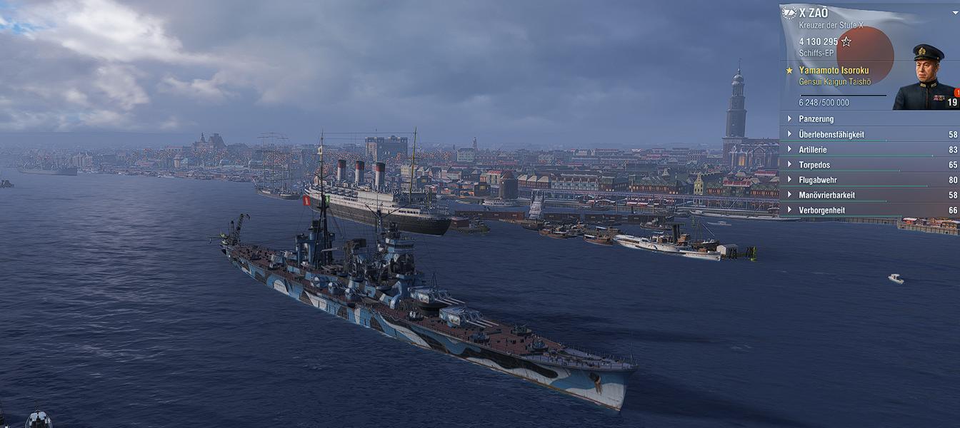 Die Zao ist ein schwerer Kreuzer der japansichen Flott, wobei der Hauptaugenmerk auf den starken Torpedos liegt. Die Hauptbewaffnung besteht aus 4 Drillingstürmen mit 203 mm und einer Nachladezeit von 13,6 s. Die Feuerreichweite beträgt 16,2 km. Die Torpedos mit sehr hohem Schadenspotential haben eine Ladezeit von 171 s und erreichen mit 76 kn ihr Ziel noch in einer Entfernung von 12 km. Die Zao erreicht mit ihren 159000 PS eine Geschwindigkeit von 34,5 kn bei einer Ruderstellzeit von 7,7 s und einem Wendekreis von 840m. Dadurch ist sie sehr wendig und agil. Durch ihre schmale Rumpfform ist sie aus größerer Entfernung sehr schwierig zu treffen.