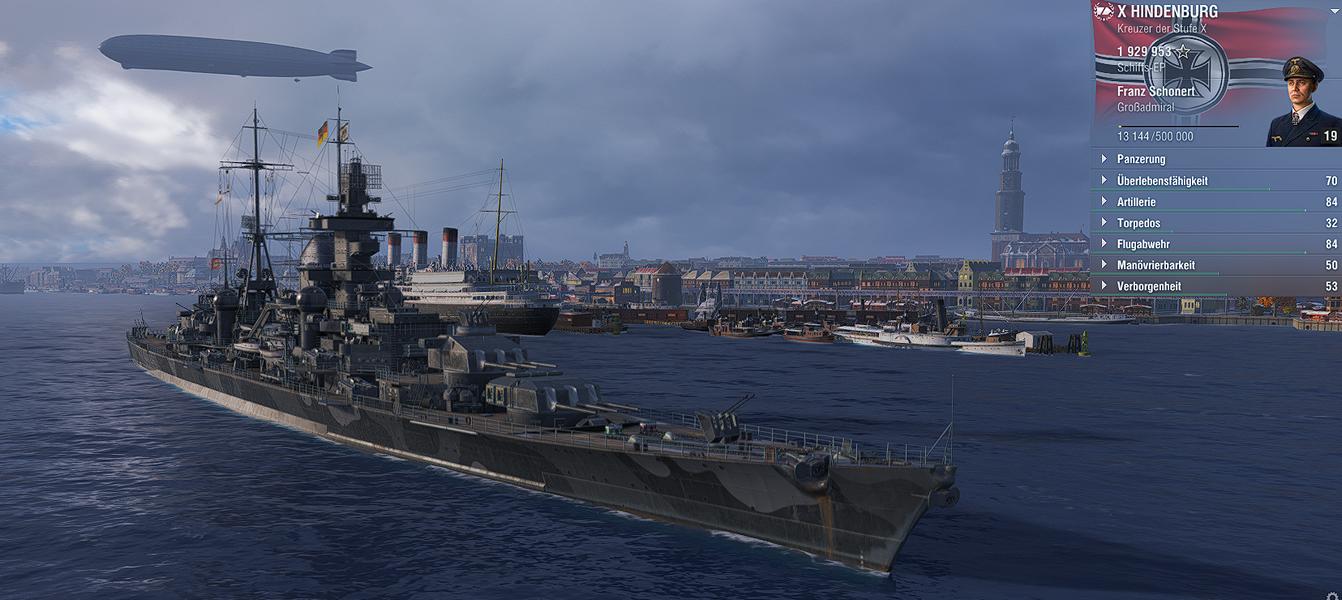 Die Hindenburg ist ein deutscher schwerer Kreuzer. Er besitzt 4 Haupttürme mit jeweils 3 x 203mm Rohren und einer Ladezeit von 9,8 s. Die Feuerreichtweite beträgt 17,8 km. Zusätzlich ist die Hindenburg mit jewels 2x4 Torpedowerfern pro Seite ausgerüsted. Die Flugabwehr besteht aus 30 Fla-Lafetten unterschiedlichen Kalibers. Die Motoren haben eine Leistung von 155000 PS und bringen das Schiff auf eine Endgeschwindigkeit von 31 kn. Die Ruderstellzeit von 12,1 s und einem Wenderadius von 800 macht den Kreuzer sehr wendig.